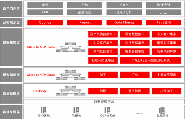 数据集市层:同时,通过使用GBase 8a MPP Cluster构建了针对上层业务的资负集市,零售集市,个人客户集市,对公客户集市、分行数据集市、运营风控集市、信用风险集市、财务数据集市、广东分行信用预警分析系统以及分析数据集市等各个集市子系统。为了实现数据的高安全、系统的高可用,采用双活集群组成数据仓库。数据仓库主库加工后的数据,通过DBLink方式,由主库传输到集市环境。