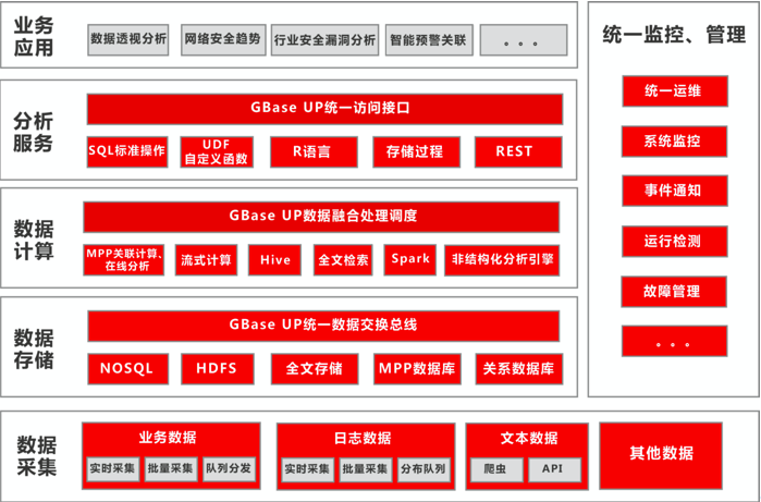 基于GBase UP融合架构构建DaaS平台:构建的大数据平台兼具OLTP的稳定高效的事务数据库、OLAP大规模分布式并行MPP数据库集群、NoSQL等多种大规模结构化、半结构化与非结构化数据处理技术,构建了对外统一,对内可扩展的大数据平台,支撑结构化数据、非结构化、半结构化数据的采集、存储与计算应用,能够适应OLAP、OLTP和NOSQL三种计算模型的业务场景。